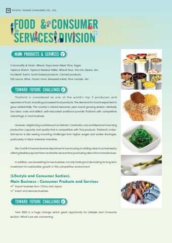 Commodity & Grain: Wheat, Soya bean Meal, Rice, Sugar, Tapioca Starch, Tapioca Residue Pellet, Wheat Flour, Pre-mix, Beans, etc.Foodstuff: Surimi, Surimi based products, Canned products, Fish sauce, Wine, Frozen food, Seaweed salad, Rice cracker, etc.Thailand is considered as one of the world’s top 5 producers and exporters of food, including processed food products. The demand for food is expected to grow substantially. The country’s natural resources, year-round growing season, relatively low labor costs and skilled, well-educated workforce provide Thailand with competitive advantage in food business.However, neighboring countries such as Vietnam, Cambodia, Laos and Myanmar have rising production capacity and quality that is competitive with Thai products. Thailand’s indus- trial sector is also seeing mounting challenges from higher wages and worker shortages, particularly in labor-intensive industries.We, Food & Consumer Services department is now focusing on adding value to our business by offering flexible payment term and better service than purchasing direct from manufacturer.In addition, we are seeking for new business, not only trading but also looking for long term investment for sustainable growth in this competitive environment.(Lifestyle and Consumer Section).Main Business : Consumer Products and ServicesImport business from China and Japan.Event and services business.Year 2020 is a huge change which great opportunity for Lifestyle and Consumer section; What’s we are concerning;18 TOYOTA TSUSHO (THAILAND) CO., LTD.