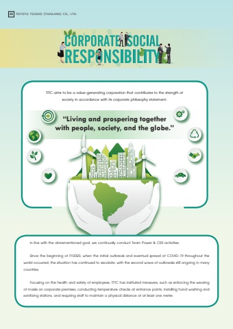 “Living and prospering together with people, society, and the globe.”TTTC aims to be a value-generating corporation that contributes to the strength of society in accordance with its corporate philosophy statement:In line with the aforementioned goal, we continually conduct Team Power & CSR activities.Since the beginning of FY2020, when the initial outbreak and eventual spread of COVID-19 throughout the world occurred, the situation has continued to escalate, with the second wave of outbreaks still ongoing in many countries. Focusing on the health and safety of employees, TTTC has instituted measures, such as enforcing the wearing of masks on corporate premises, conducting temperature checks at entrance points, installing hand washing and sanitizing stations, and requiring staff to maintain a physical distance of at least one meter.26 TOYOTA TSUSHO (THAILAND) CO., LTD.